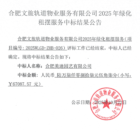 合肥文旅轨道物业服务有限公司2025年绿化租摆服务中标结果公告