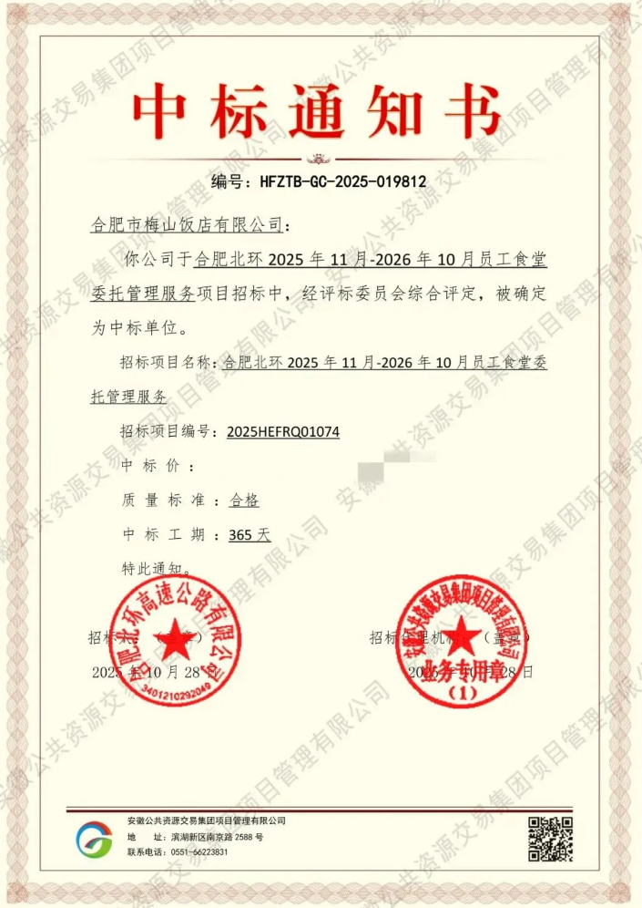 本项目将为合肥北环公司本部及其所辖四个站点食堂提供全方位的餐饮管理及膳食服务。梅山饭店餐饮团队将精准对接业主需求,以安全、健康、优质的膳食兑现日常承诺,以暖心暖胃的餐饮保障擦亮服务品牌。