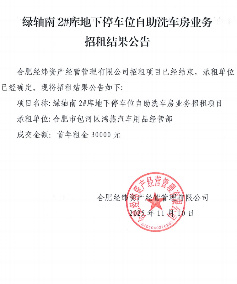 绿轴南2#库地下停车位自助洗车房业务招租结果公告