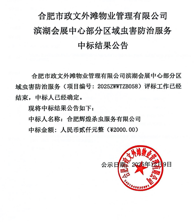 合肥市政文外滩物业管理有限公司滨湖会展中心部分区域虫害防治服务中标结果公告