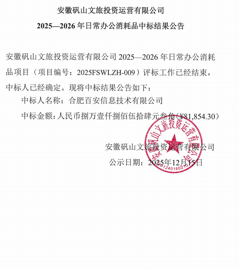 安徽矾山文旅投资运营有限公司2025-2026年日常办公消耗品中标结果公告