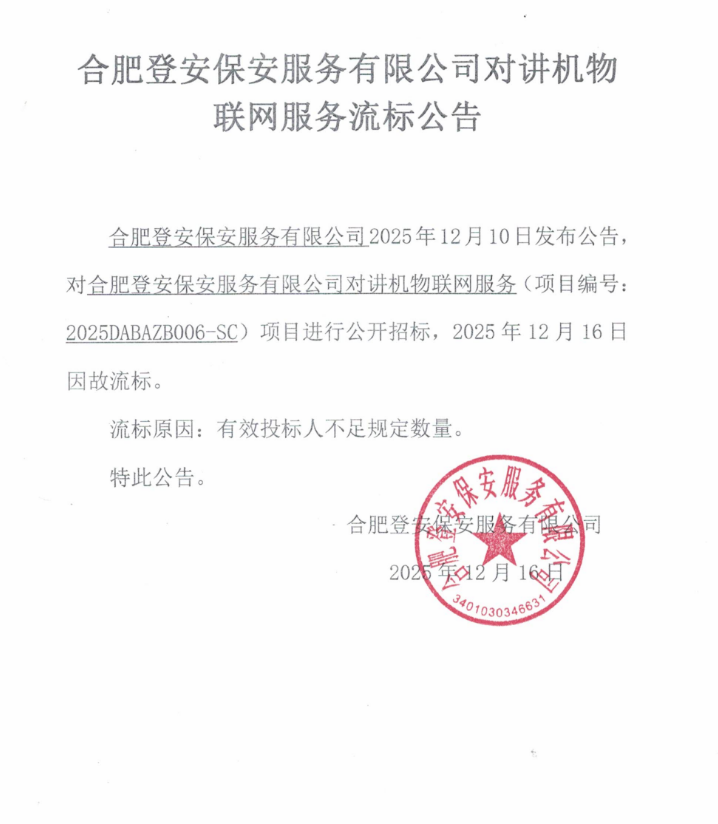 合肥登安保安服务有限公司对讲机物联网服务流标公告
