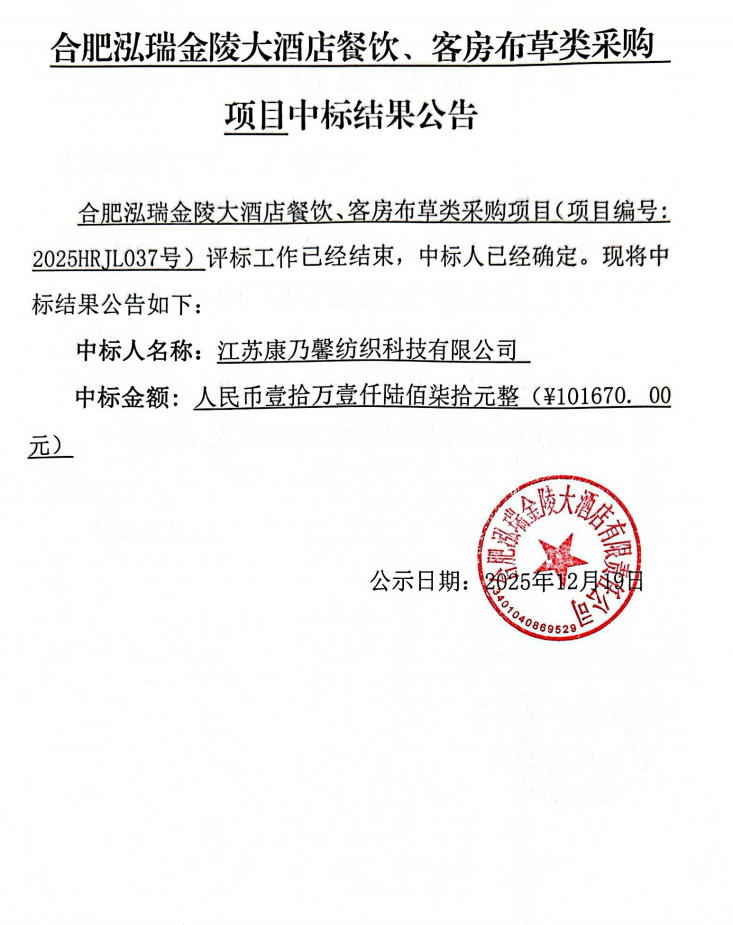 合肥泓瑞金陵大酒店餐饮、客房布草类采购项目中标结果公告