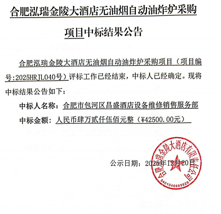 合肥泓瑞金陵大酒店无油烟自动油炸炉采购项目中标结果公告