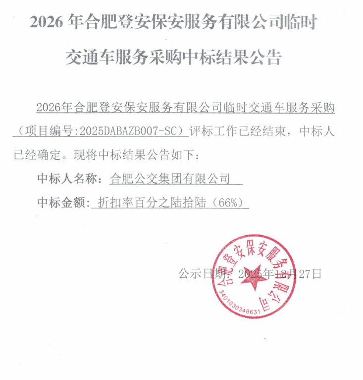 2026年合肥登安保安服务有限公司临时交通车服务采购中标结果公告