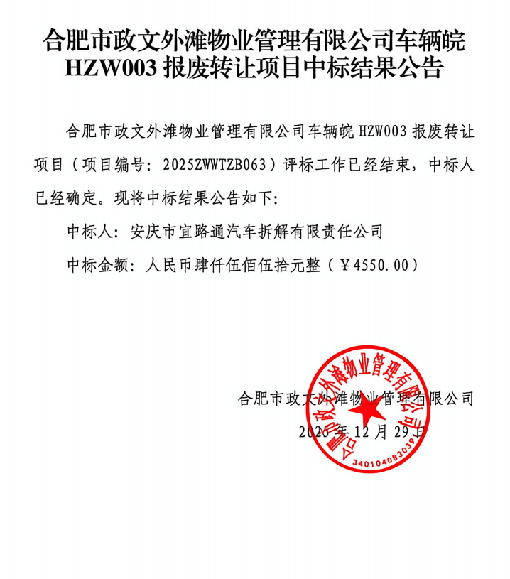 合肥市政文外滩物业管理有限公司车辆皖HZW003报废转让项目中标结果公告