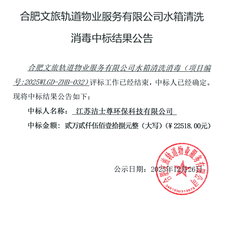 合肥文旅轨道物业服务有限公司水箱清洗消毒中标结果公告