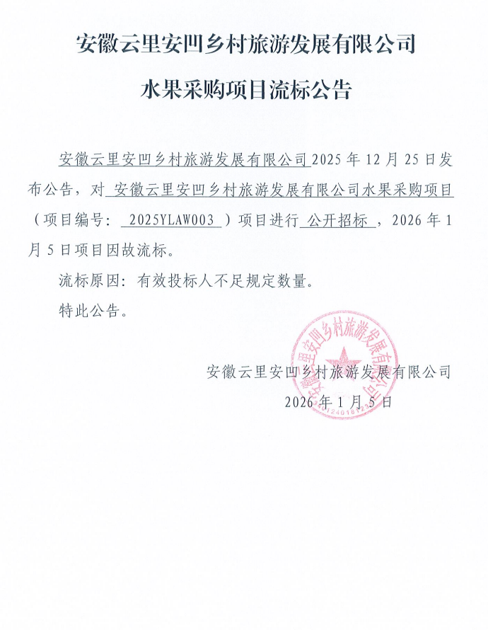 安徽云里安凹乡村旅游发展有限公司水果采购项目流标公告