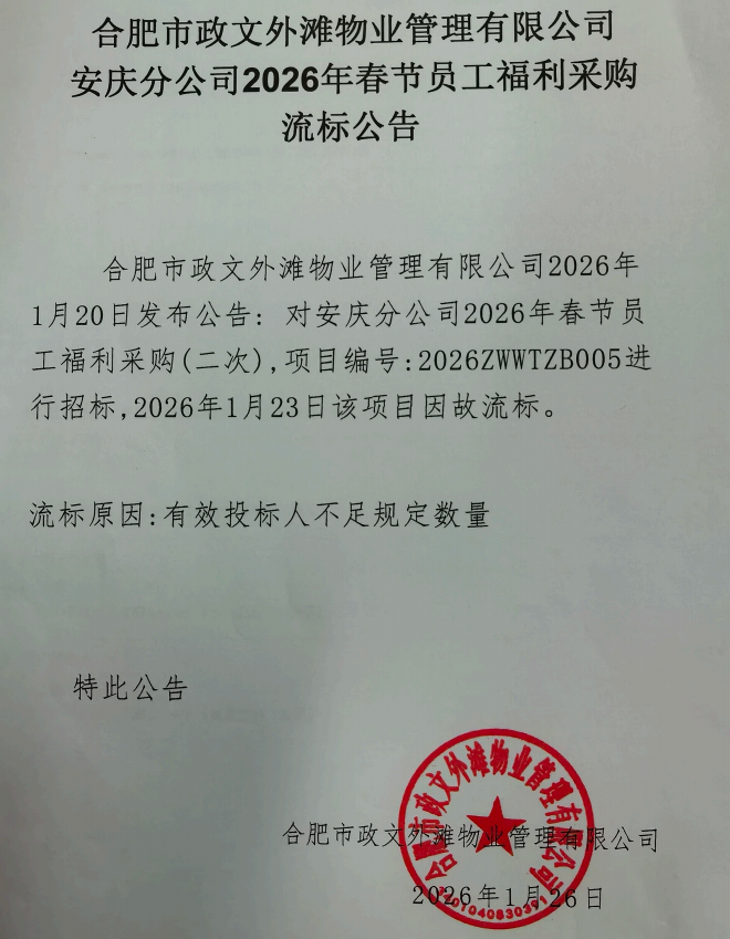 合肥市政文外滩物业管理有限公司安庆分公司2026年春节员工福利采购流标公告