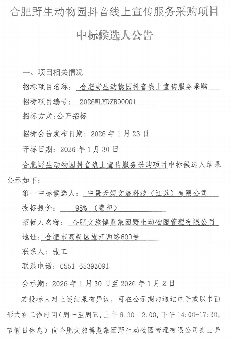 合肥野生动物园抖音线上宣传服务采购项目中标候选人公告