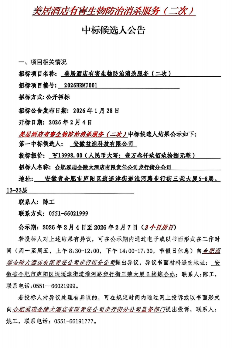 美居酒店有害生物防治消杀服务(二次) 中标候选人公告