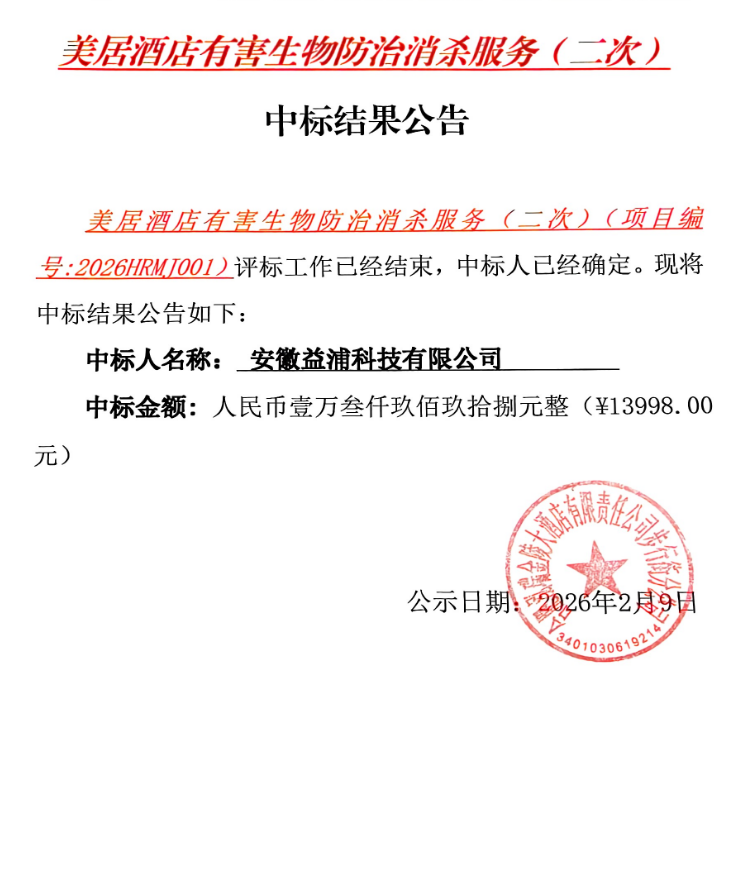 美居酒店有害生物防治消杀服务(二次)中标结果公告