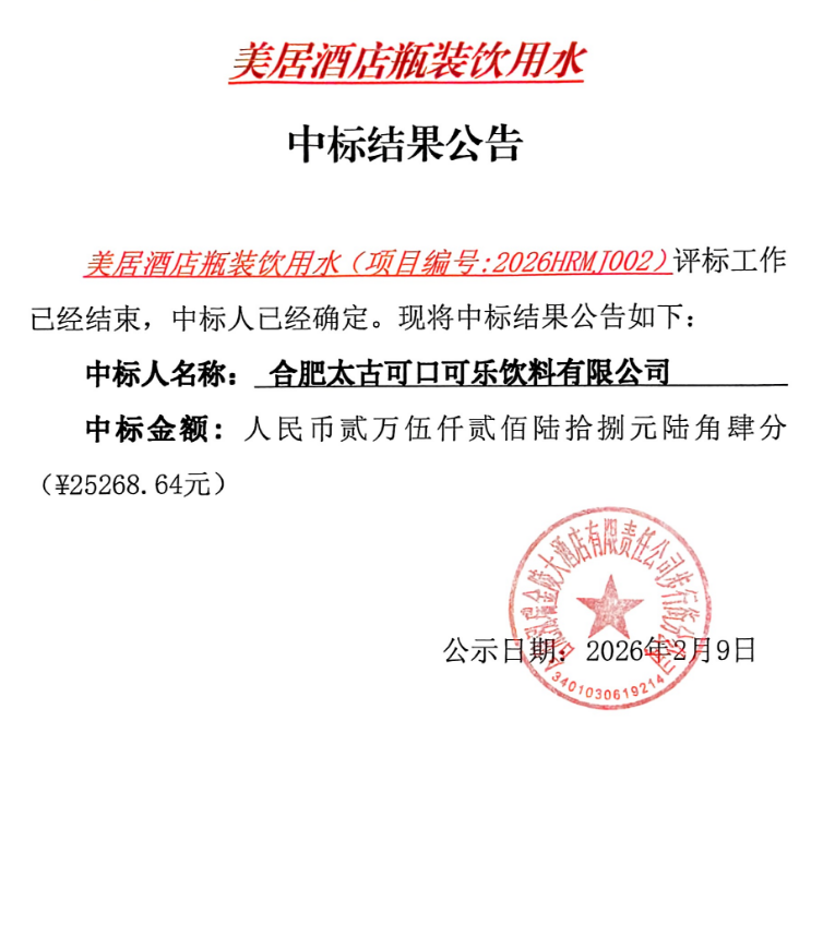美居酒店瓶装饮用水中标结果公告