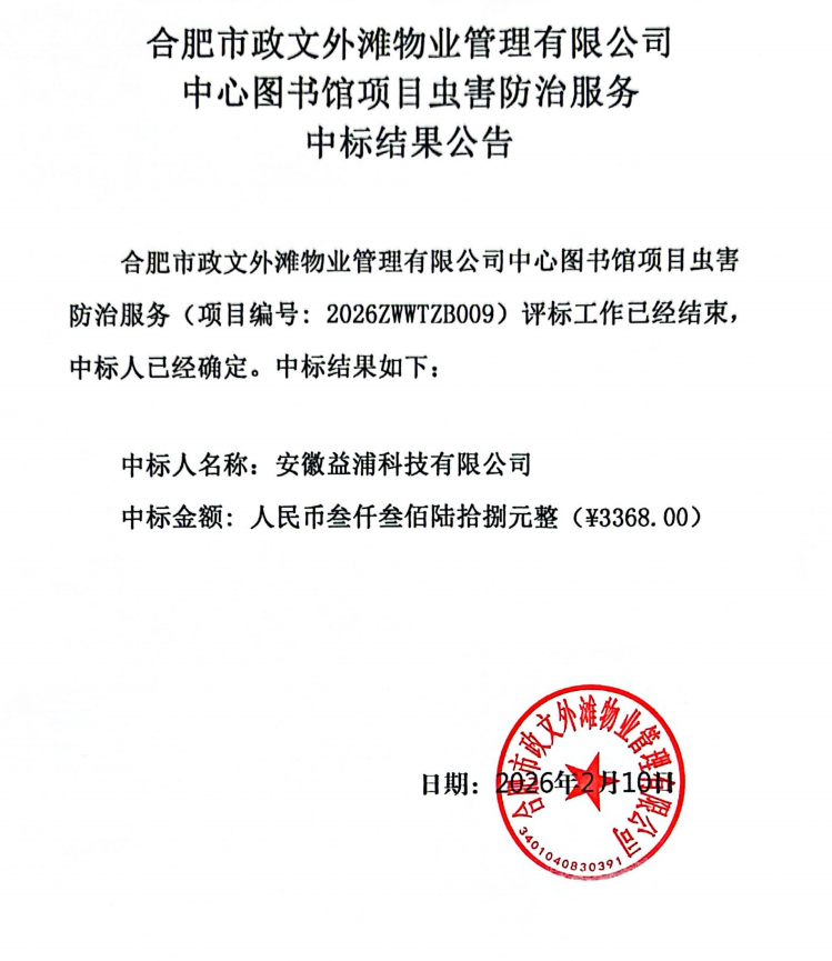 合肥市政文外滩物业管理有限公司中心图书馆项目虫害防治服务中标结果公告