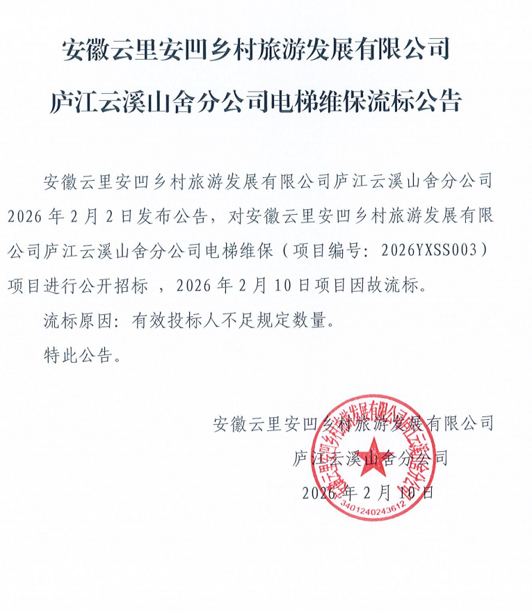 安徽云里安凹乡村旅游发展有限公司庐江云溪山舍分公司电梯维保流标公告