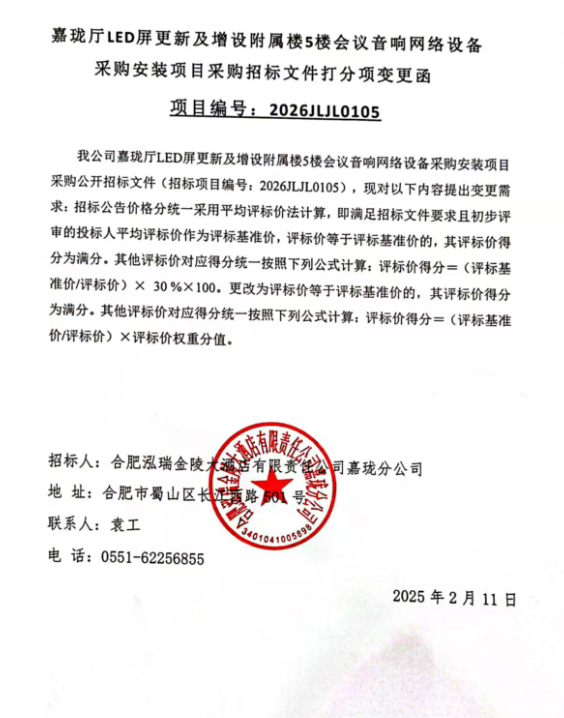 嘉珑厅LED屏更新及增设附属楼5楼会议音响网络设备采购安装项目采购招标文件打分项变更函
