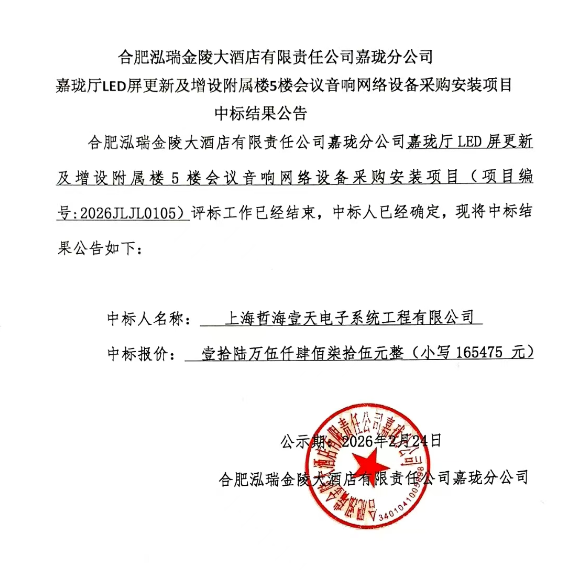 合肥泓瑞金陵大酒店有限责任公司嘉珑分公司嘉珑厅LED屏更新及增设附属楼5楼会议音响网络设备采购安装项目中标结果公告