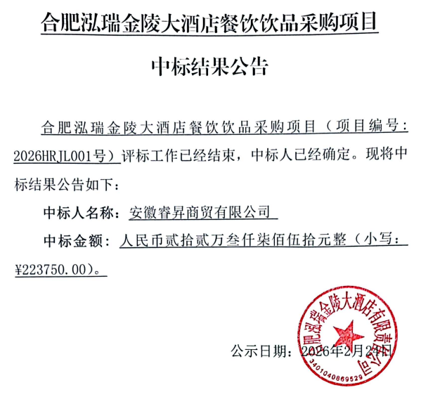 合肥泓瑞金陵大酒店餐饮饮品采购项目中标结果公告