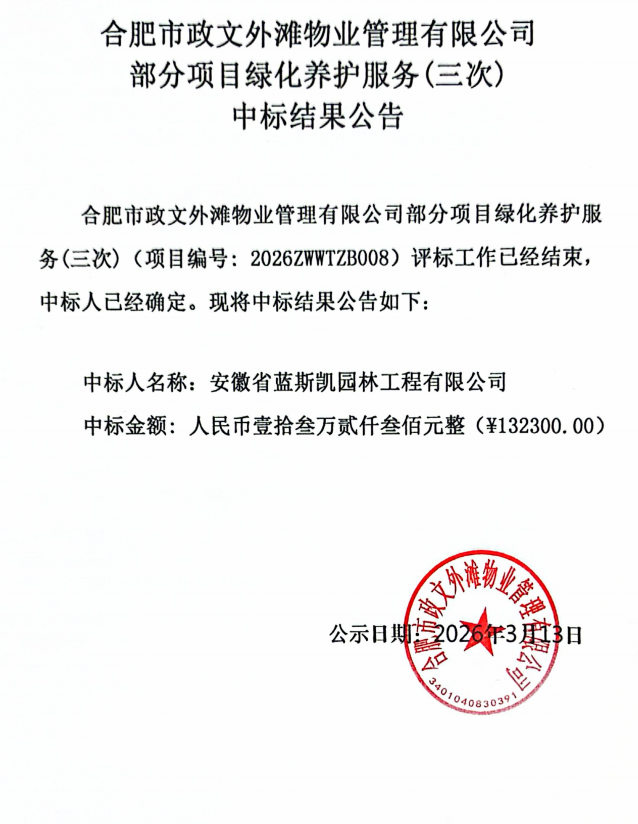 合肥市政文外滩物业管理有限公司部分项目绿化养护服务(三次)中标结果公告
