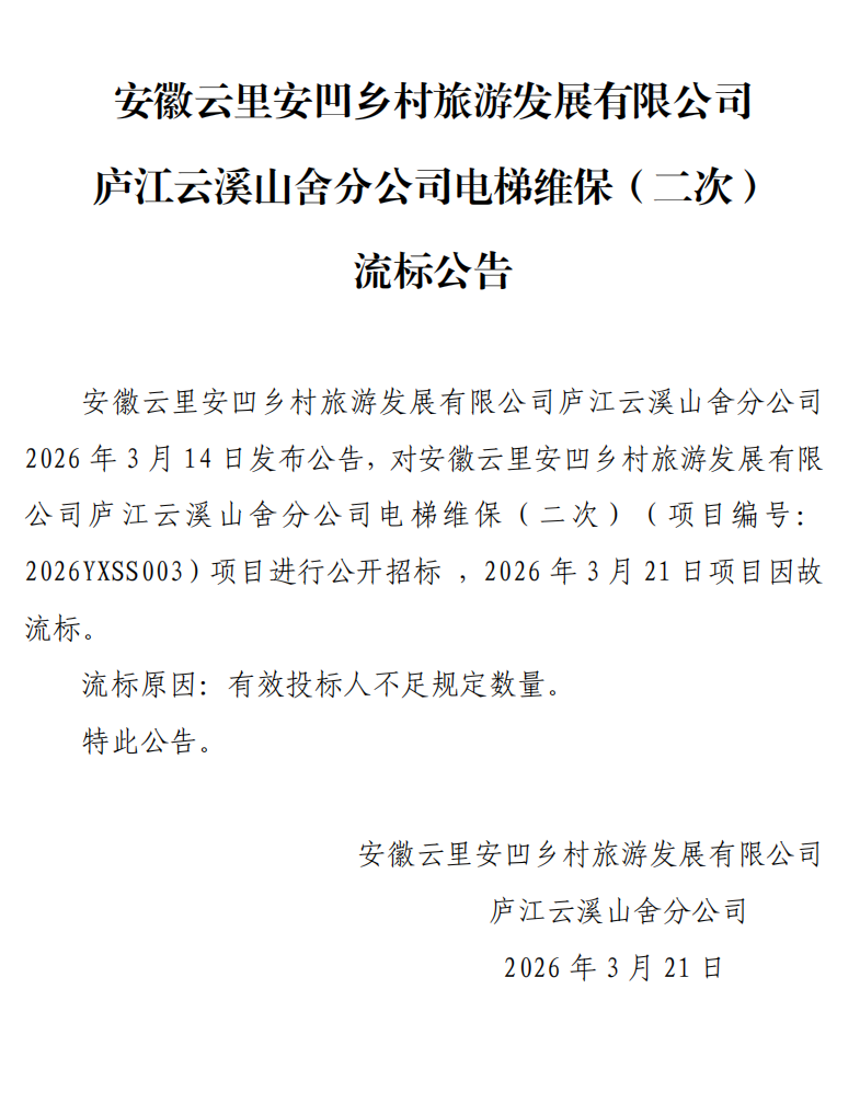安徽云里安凹乡村旅游发展有限公司庐江云溪山舍分公司电梯维保(二次)流标公告