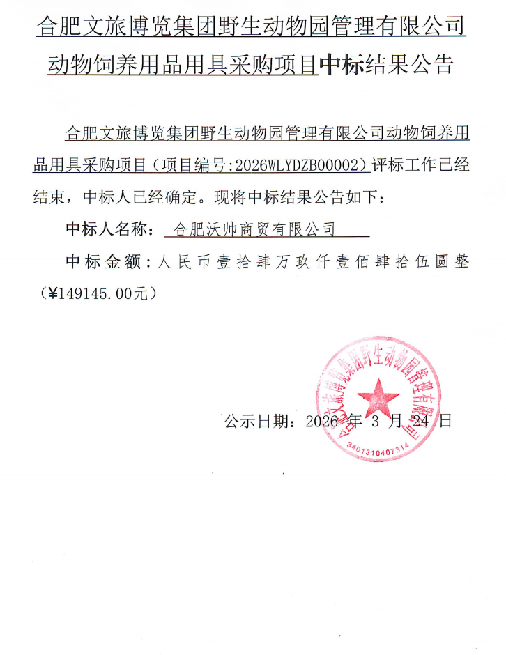 合肥文旅博览集团野生动物园管理有限公司动物饲养用品用具采购项目中标结果公告