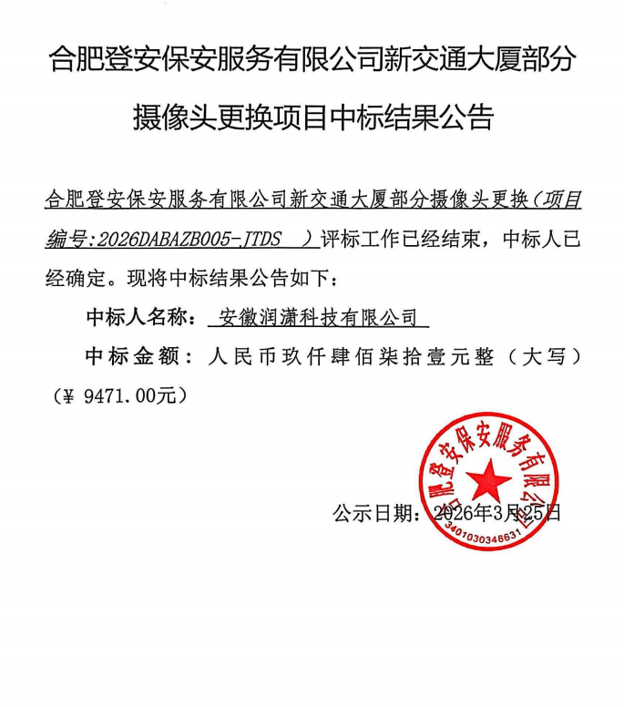 合肥登安保安服务有限公司新交通大厦部分摄像头更换项目中标结果公告