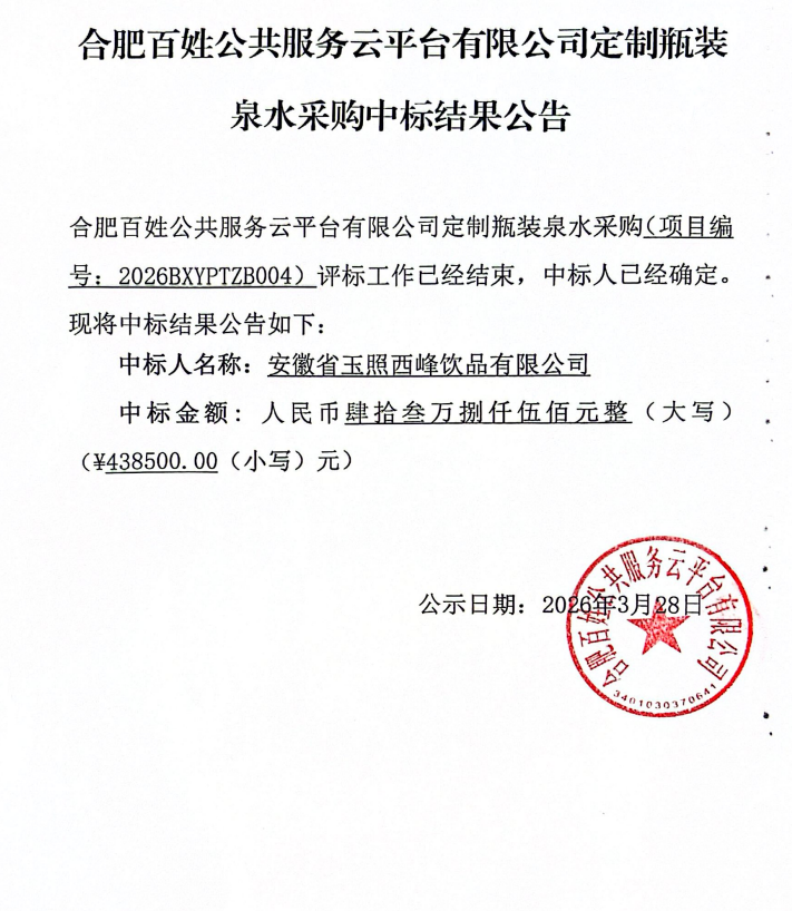 合肥百姓公共服务云平台有限公司定制瓶装泉水采购中标结果公告