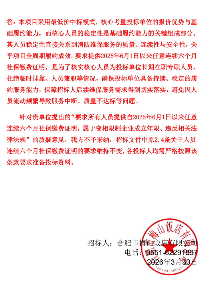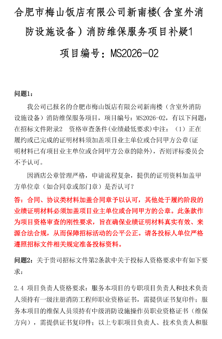 合肥市梅山饭店有限公司新南楼(含室外消 防设施设备)消防维保服务项目补疑1