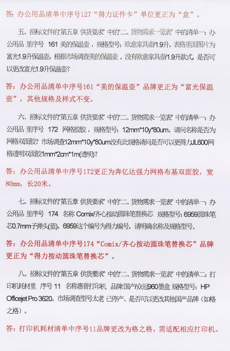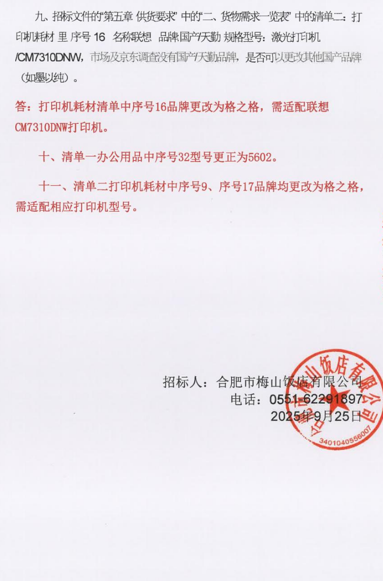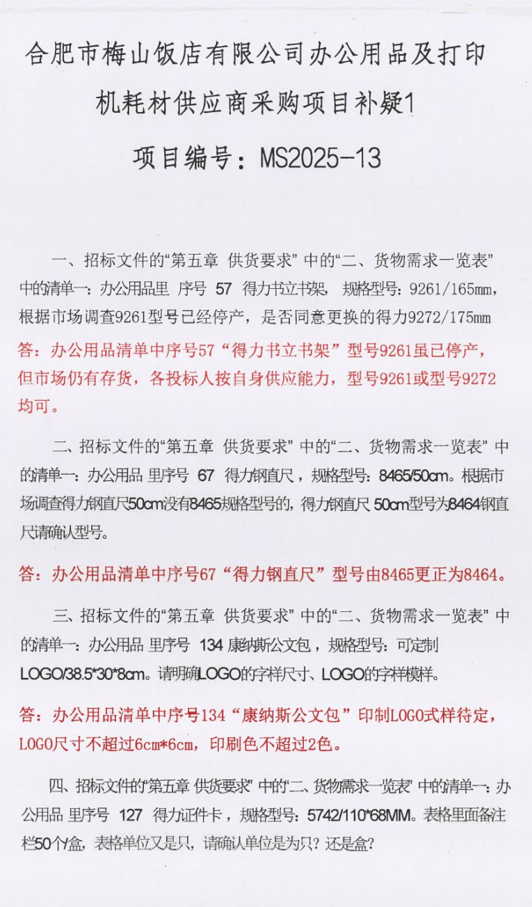 合肥市梅山饭店有限公司办公用品及打印机耗材供应商采购项目补疑1