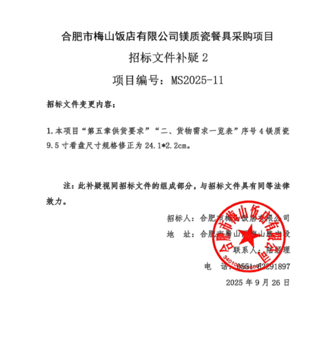 合肥市梅山饭店有限公司镁质瓷餐具采购项目招标文件补疑 2