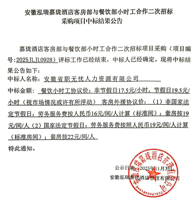 安徽泓瑞嘉珑酒店客房部与餐饮部小时工合作二次招标采购项目中标结果公告