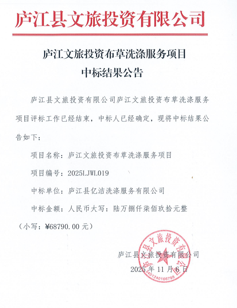 庐江文旅投资布草洗涤服务项目中标结果公告