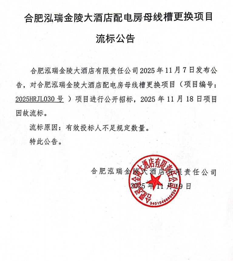 合肥泓瑞金陵大酒店配电房母线槽更换项目流标公告