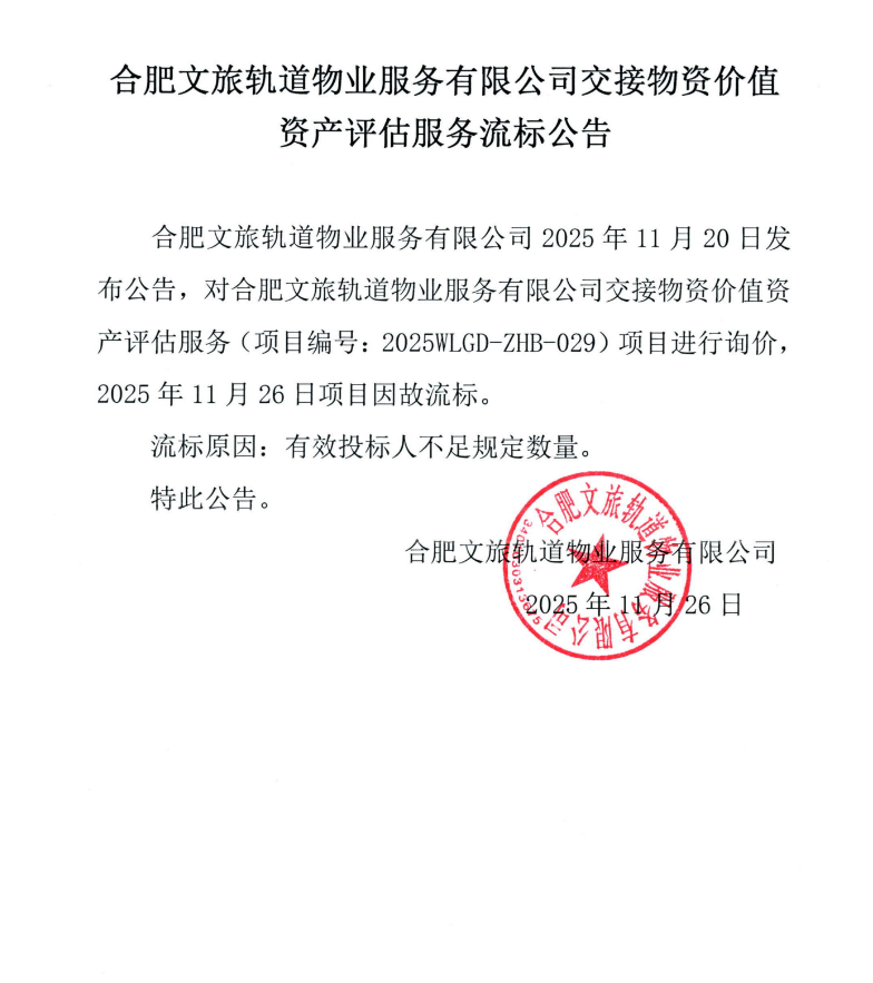 合肥文旅轨道物业服务有限公司交接物资价值资产评估服务流标公告