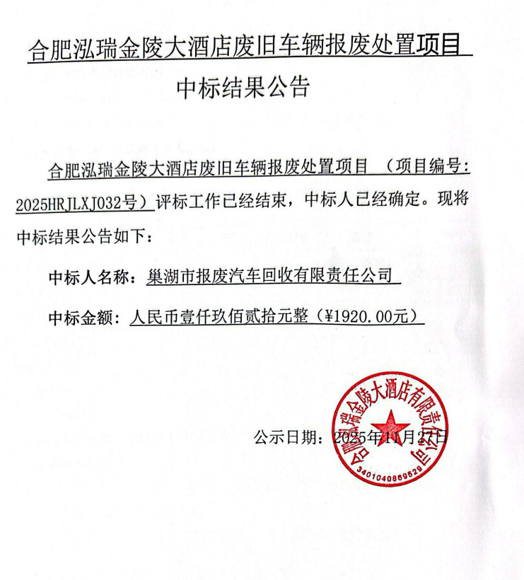 合肥泓瑞金陵大酒店废旧车辆报废处置项目中标结果公告