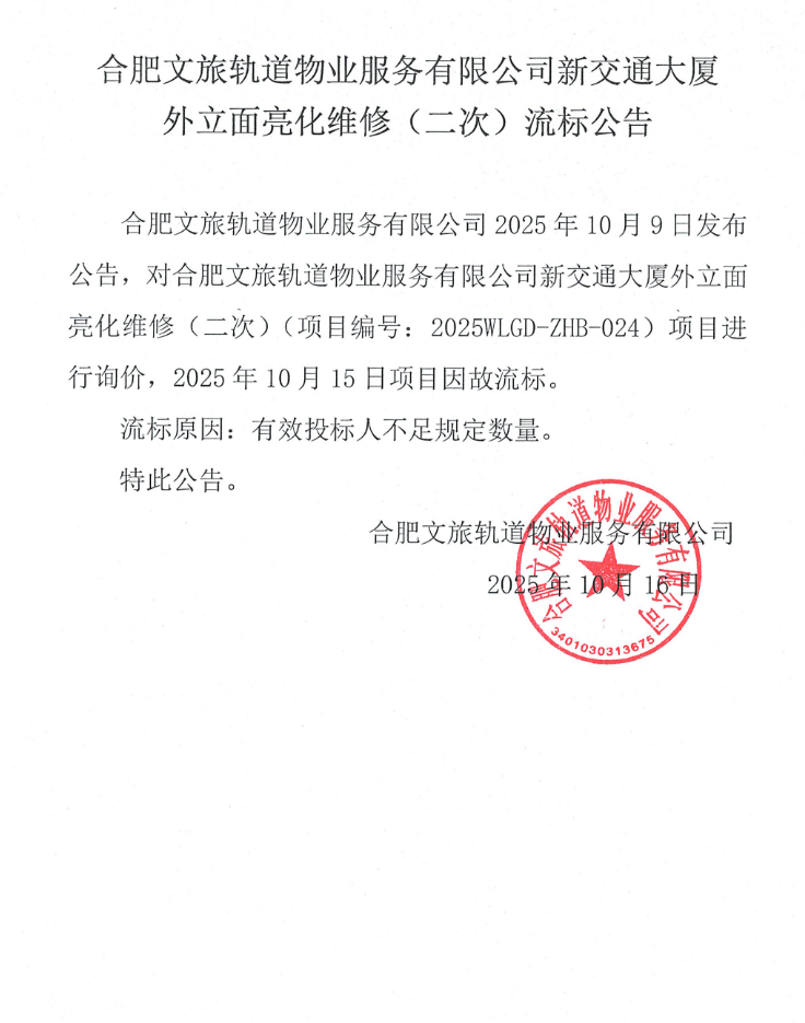 合肥文旅轨道物业服务有限公司新交通大厦外立面亮化维修(二次)流标公告