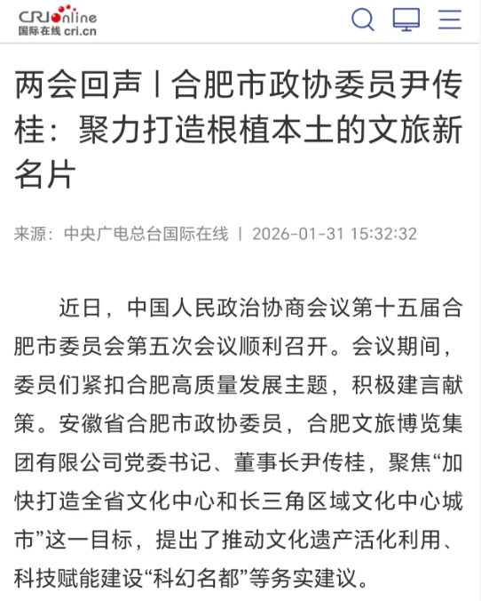 近日,中国人民政治协商会议第十五届合肥市委员会第五次会议顺利召开。会议期间,委员们紧扣合肥高质量发展主题,积极建言献策。安徽省合肥市政协委员,合肥文旅博览集团有限公司党委书记、董事长尹传桂,聚焦“加快打造全省文化中心和长三角区域文化中心城市”这一目标,提出了推动文化遗产活化利用、科技赋能建设“科幻名都”等务实建议。