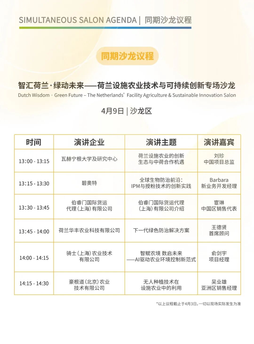 四家深耕中国市场的荷兰(及欧洲)技术领军企业将齐聚一堂,带来一场聚焦设施农业前沿技术的专场沙龙。从生物防治、智能环控、环境调节幕布到智慧物流,活动将搭建一个高端交流平台,分享国际前沿的“无人种植”技术、AI驱动的环境控制新范式以及本土化的综合防治方案,为中国现代农业的提质增效与可持续发展提供可借鉴的“荷兰路径”。