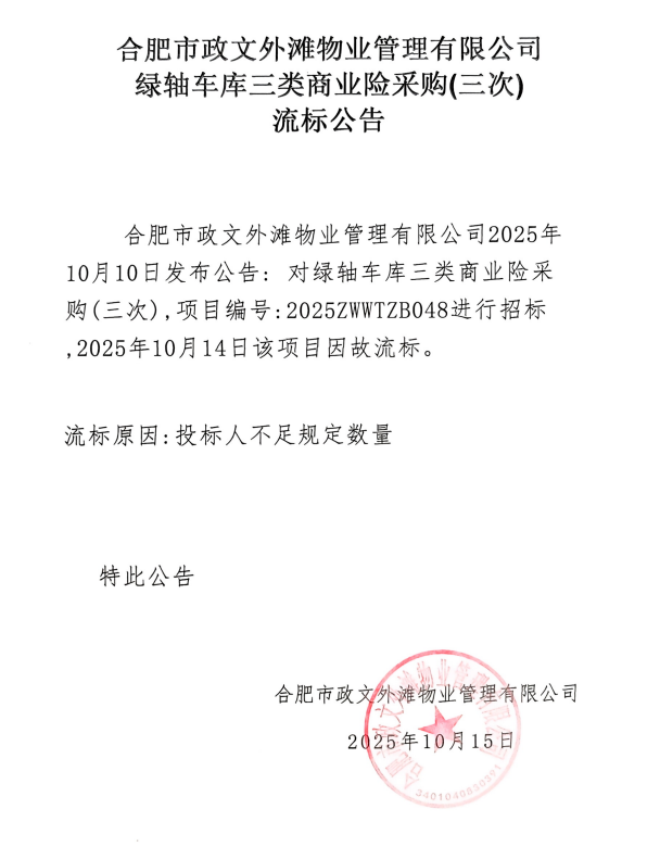 合肥市政文外滩物业管理有限公司绿轴车库三类商业险采购(三次)流标公告